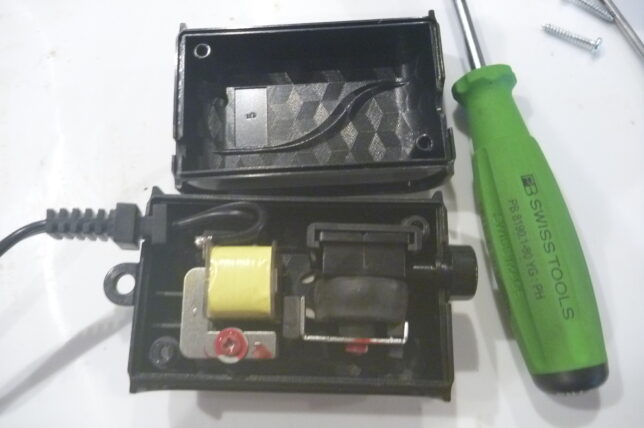 外してダメモトでハンダしなおしてみたけど復活しませんでした。コイル下側(巻き始め)の方の細い線が断線したっぽい。線が細いんですよ。ハンダゴテが高熱過ぎたか?台座のプラスチックも溶けた。トドメを刺したみたい。細い線。これを巻き直す気にもならず。