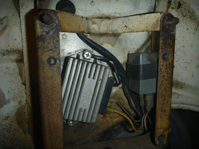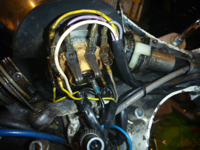 後ウインカートラブルの場合、ここは最後に見る部分。稀に端子が抜けかかっていたりする。ガソリンタンクを外さないとたどり着けないので手間がかかる。⇧防錆剤噴霧+ガソリンが漏れたので湿った感じになってます。