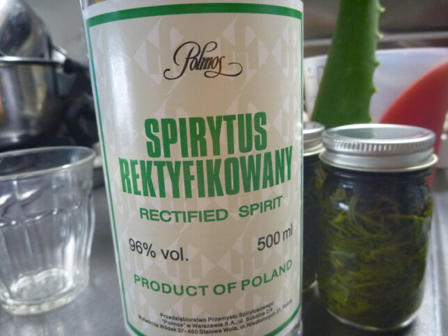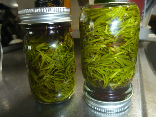 チンキにするにあたり、ローズマリーは高濃度アルコールでないと抽出されない成分があるらしいので、その事だけ念頭に感覚で作業します。ローズマリーの葉先を切って、枝ごと荒っぽくガシガシと小瓶に詰め、いっぱいまでアルコールを注ぐ。何グラムとか測ってやりません。葉も洗わないし。切たてをそのまま。高濃度アルコールですしね。大丈夫でしょうたぶん。瓶は事前に少量のアルコールでゆすぎました。