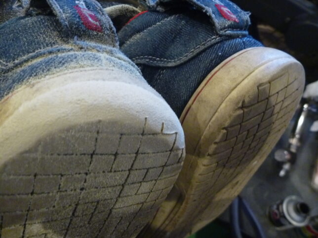 効果が如何程かわかりませんが、今ある作業靴のかかとを少し削ってみました。