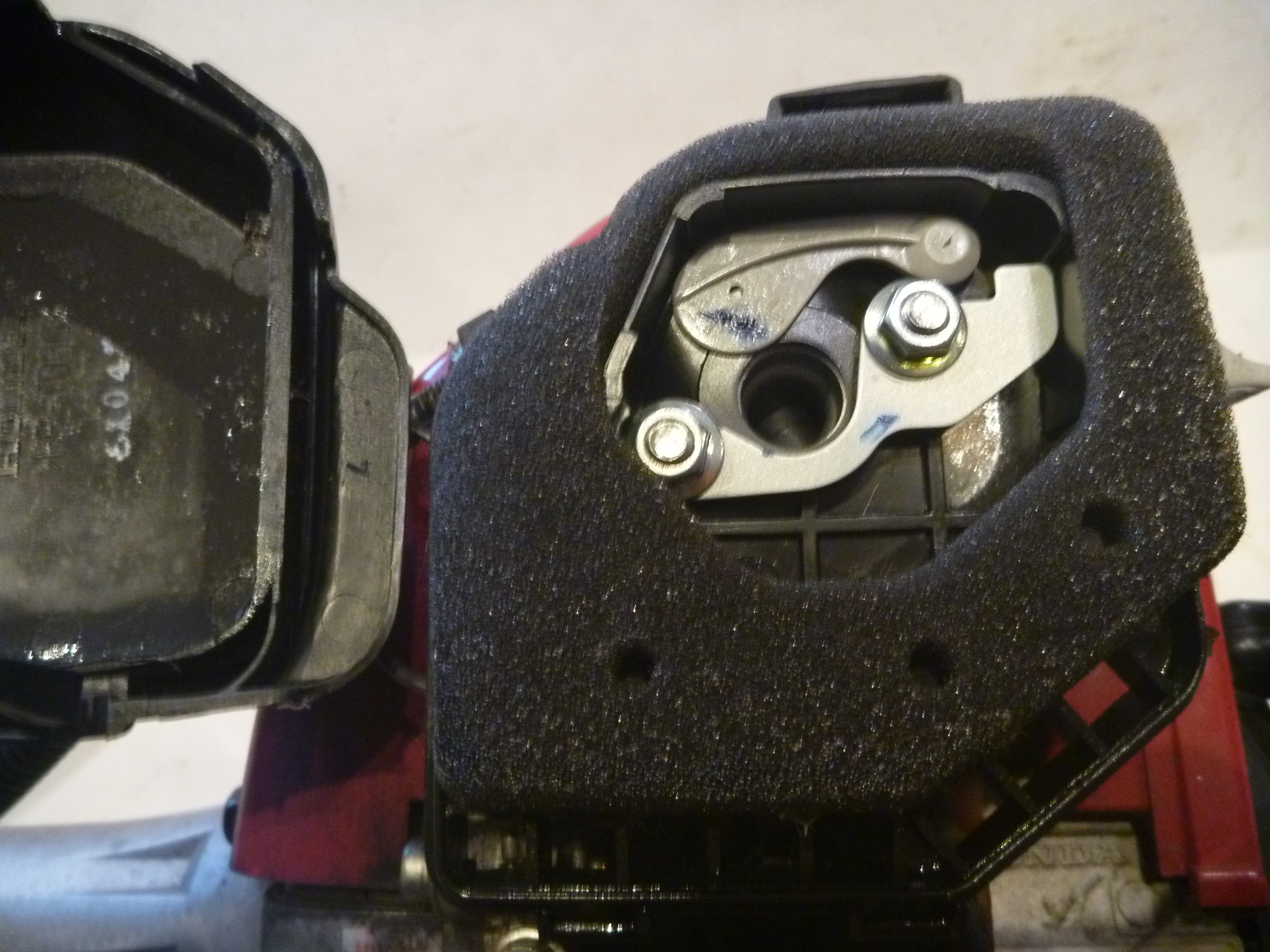 エアクリーナーは中性洗剤でやさしく水洗い。揉み洗い。スポンジ(下の方)に多少劣化が見られました。次回交換か。