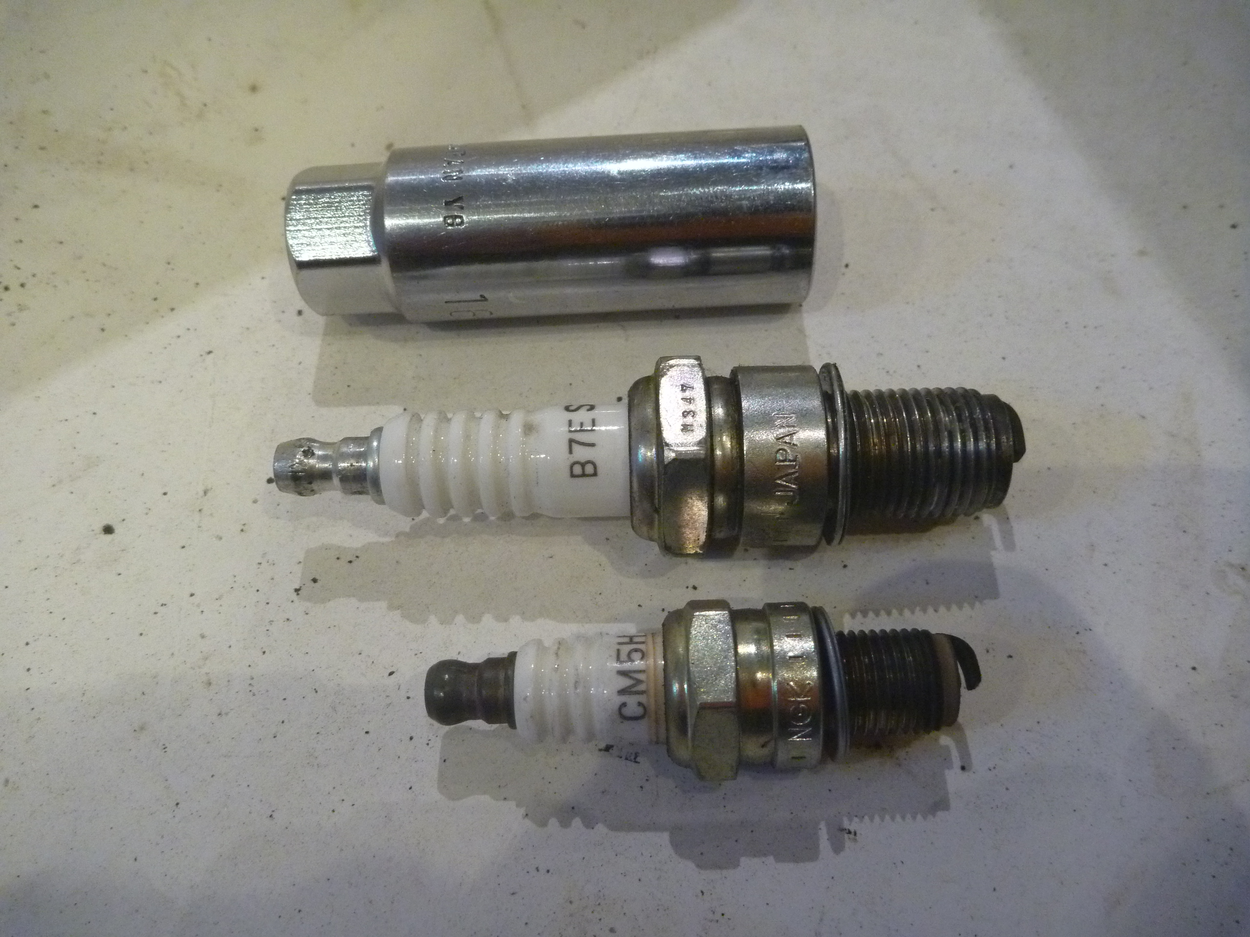 小さいプラグが刈り払い機Cサイズ。バイクのB7ESと比較