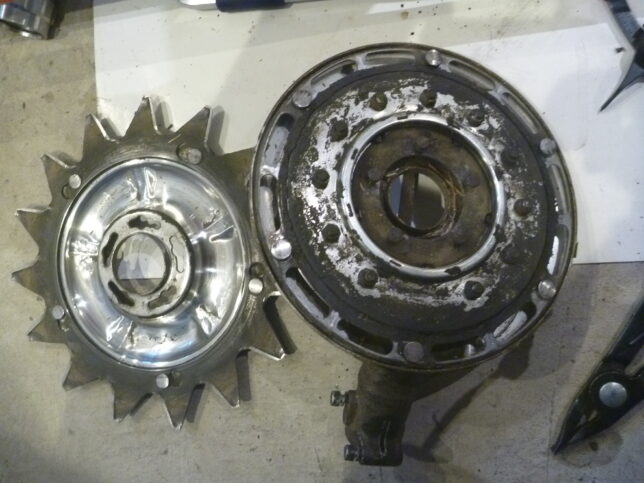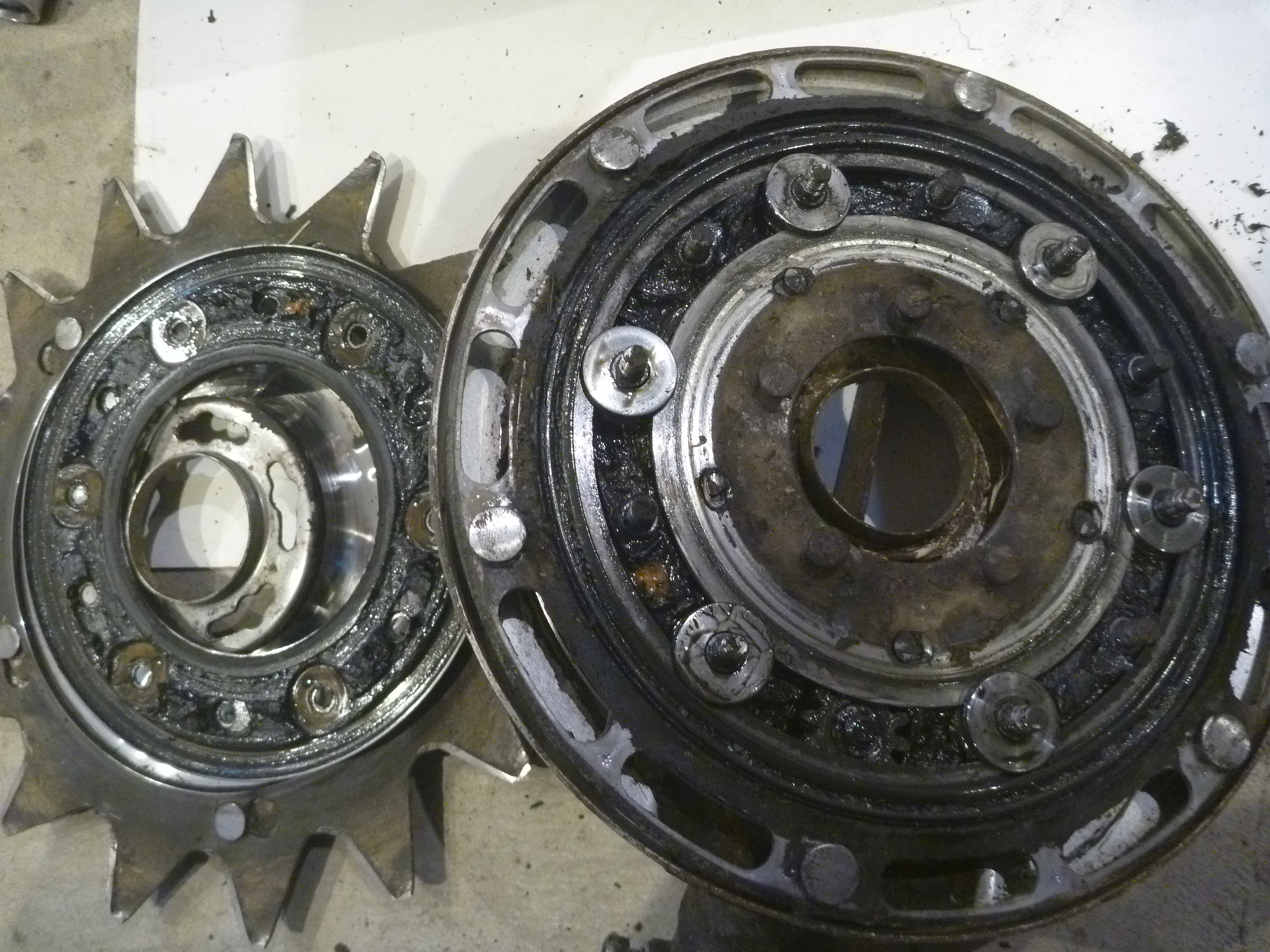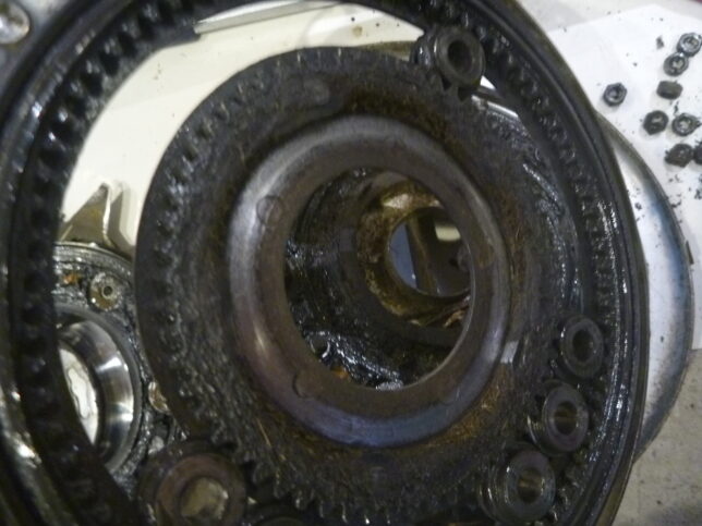 内側のリングギア取り付け部が結構遊んでいる様です。最初がどういう状態だったか思い出せませんが、やはり全体的に摩耗・消耗が進んでいます。まだ使えていますが、そろそろ次を検討する時期かもしれません。