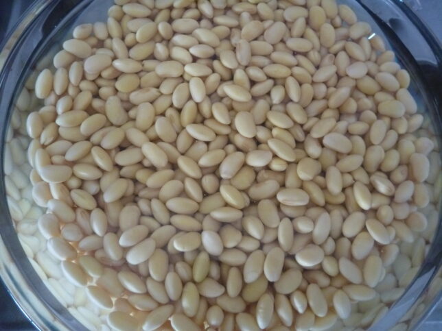 丸い乾燥大豆が、水で戻すと楕円形のマメに復活。ちょっと不思議。