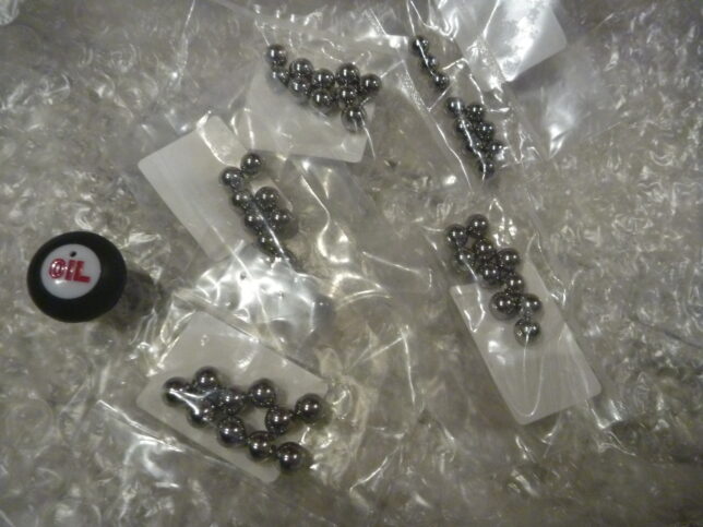 一番近かったのがインチサイズの1/4で、ミリ変換したら6.35㎜。たぶんコレが使われていると思われる。準備したのは、その下サイズだとミリで6㎜・上は6.5㎜・インチの17/64・ミリの7㎜。見当をつけて見ていたラインナップには、この辺の鋼球(精密ボール)ミリサイズとインチサイズがあって、インチに慣れていないわたくしはミリに変換しないと分からないので不便。しょうがないですが。