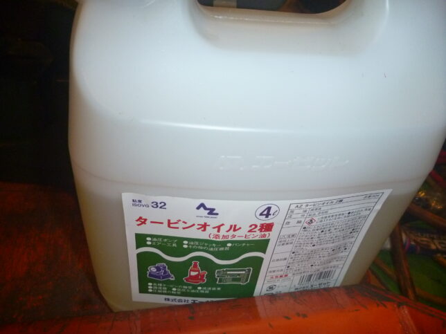 ジャッキオイル?何入れれば良いのかよく分かりませんでしたが、少々調べて、このタービンオイル(ISO VG32)を「AZの直販サイト」で購入。ちょっとお買い得になっていたパーツクリーナーと一緒に。油圧ジャッキの絵が描いてあるので、大丈夫でしょう。油圧作動油という項目。AZは、比較した他のメーカーより澄んだ色合いでした。