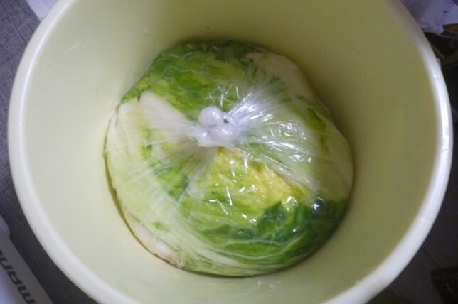 下漬け。桶からはみ出ているけど気にしない。袋の口は閉じられるので。