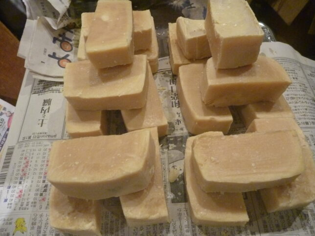 切り分けた石鹸を触ると、少し柔らかい感じ。乾燥して締まってくるのかな?