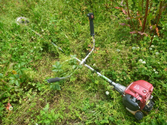 茎が硬くて回転数高めにしないと切れない。燃費も落ちる。刈った草が上に倒れて進路を塞ぎ、刈り払い機が振れない。どうしようもない時は一度機械を置いて、草をどかしつつ作業。