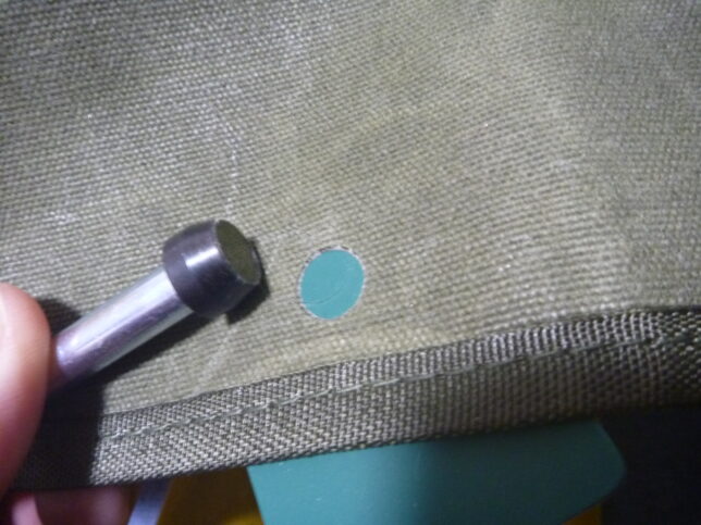 ハトメ作業初めのうちは、打ち込み具合がよく分かりませんでしたが、終わるころに慣れてきた。