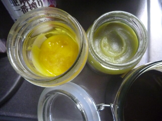 蜜蝋(よもぎ)バームは、以前よもぎを油(太白油)で煮だしたモノに蜜蝋を湯煎・調合したもの。仕込み途中に気が向いて、少しはちみつを入れてみたせい?か緩めの仕上がり。仕上がり(固まった状態)が緩く感じたら再度湯煎して蜜蝋を足す。硬かったらオイル足し。お好み・感覚で調整。