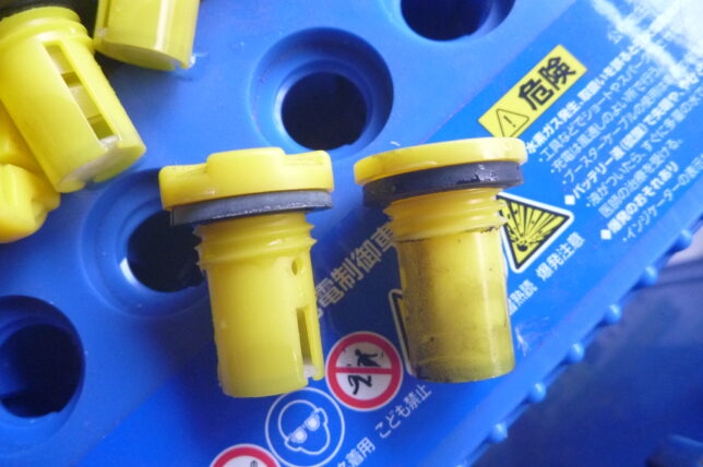 思っていたより新しいバッテリーの液量は上の方でした。ここまで入れていいのか。念のため液面を揃える程度に少量補水しておきます。