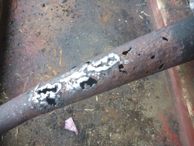 電溶(被覆アーク)で穴埋めも試みたのですが、穴の周辺が溶けて拡大・・・