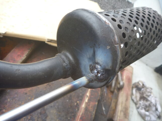 錆び腐食+鉄板が薄い+溶棒のアーク溶接機しか持っていないので、予想はしていましたが、やはりダメ。穴埋めをあきらめました。頑張ってやれば、表面は慣らされるとしても、内側はボコボコ(排気抵抗)でしょう。