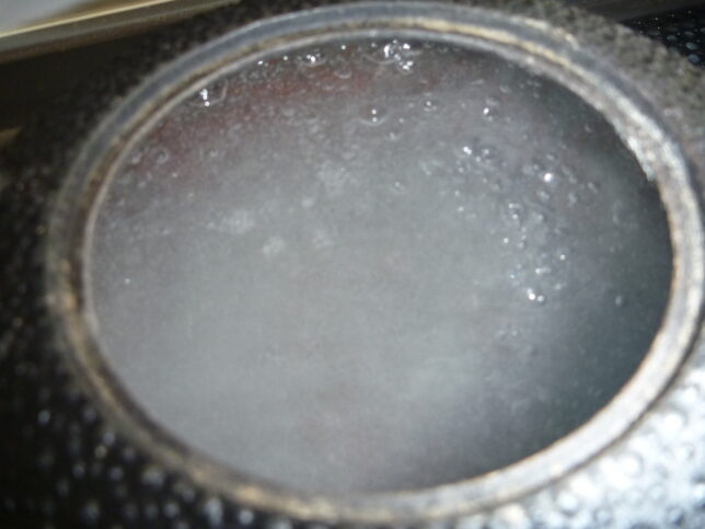鉄瓶に湯垢を付けるべく、エビアン(硬水)を入れて煮出してみます。