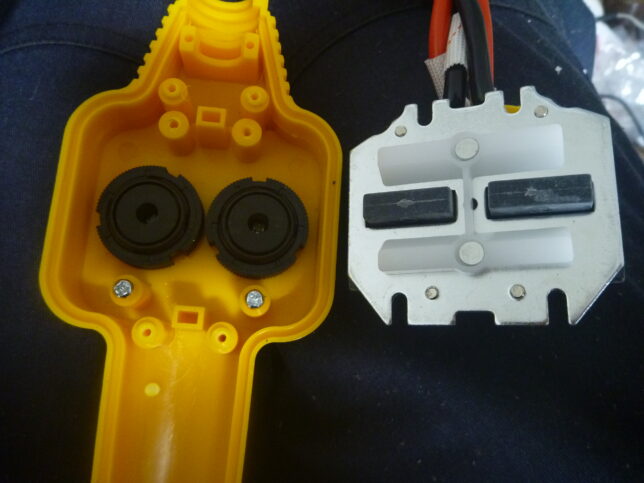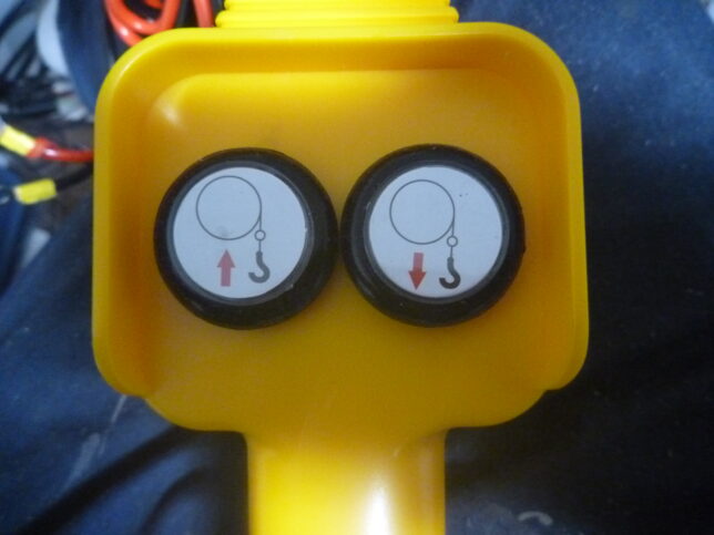大きくて野暮ったい有線リモコン。中身はリレー付きの小回路を少し期待していましたが、そんなモノは入っていませんでした。(他のウインチと同じとは限りませんので、ご注意ください)