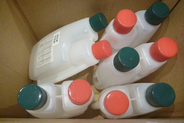 計量にビーカーも使いますが、携帯用にこんな容器も使用しております。