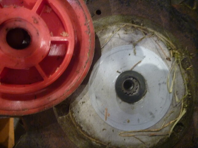 このプラスチックの円盤内側に入っているワッシャー?スペーサー?ズレやすい。シビアなクリアランスのため、ズレたまま締めたら不具合出そう。いちいち現場でセンター合わせに気を使うのもイヤなので、事前点検時に外れていたら接着剤で付ける。