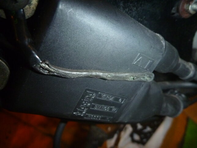CDI/イグニッションコイル部。サイドカバーで押されたか、配線の被覆にダメージあり。線はここを通るんでしたっけ?まあいいや。後ほど対処。