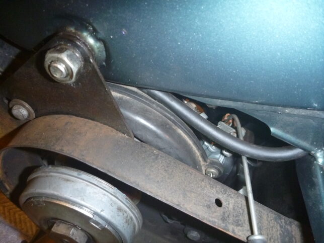 エンジン自体は車体に3か所で止まっている。ベルト調整で10㎜工具を使って、緩めたり締めたりする部分。