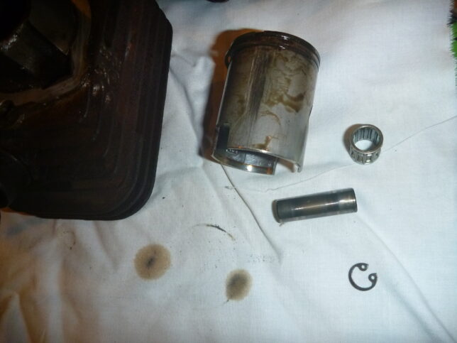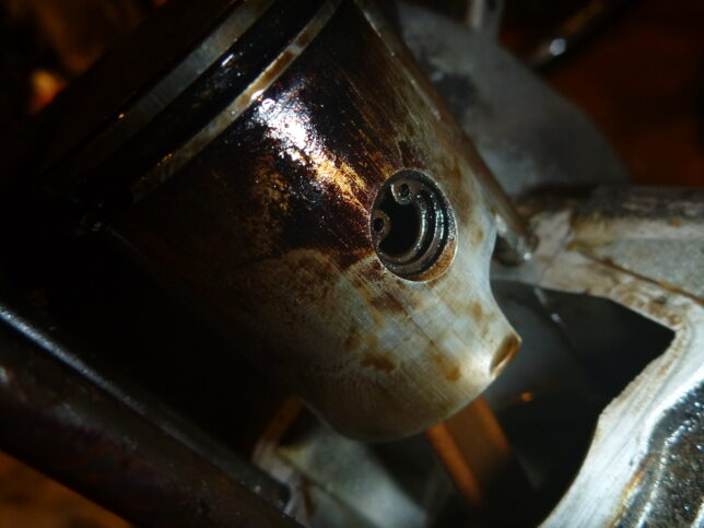 確認ついでに触ってみたら、ピストンピンの動きが悪かったので清掃。カーボン蓄積とカジリの影響と思われる。シリンダーを外すついでがあったら、リングの動きをチェック。