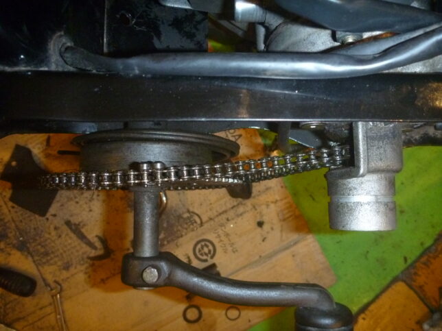 チェーン問題の他に、キック式に対するモノが車体側に何も無いので、このペダル用に車体側にストッパーを付けて、スプリングの引っかけ部分を考えなければキック機構が使えない。
