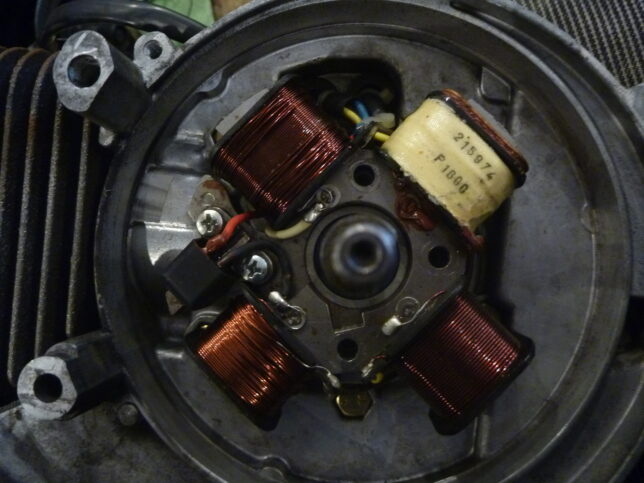 その後バッテリーレス仕様で仮組み、無負荷・負荷状態にて電圧測定してみました。結果「残念」方向。無負荷の数値(電圧値)を見て安心したのもつかの間、今回試したコイル巻き直しが思ったより出力アップに繋がっていないみたい。電流の方か。LED灯(電球より省エネ)なのに負荷状態にするとみるみる電圧が低下。このままでは実用化は厳しい。バッテリーレス(上記の小型キャパシタ)では特に。現在は仮組みで未装着灯火類もある。小型バッテリーを積んで、昼間無負荷に近い状態で走行すればマシとも思うが、それも何だか・・・。12Vという事に縛られなければいいのかもしれない。現状で、直流化とLEDの点灯範囲内にはなっているので、LED灯事態は点灯はしている。ただ、実際走行テストしていないので、この状態(未走行空ぶかし程度)では実際使用できる範囲なのか、何とも言えない。