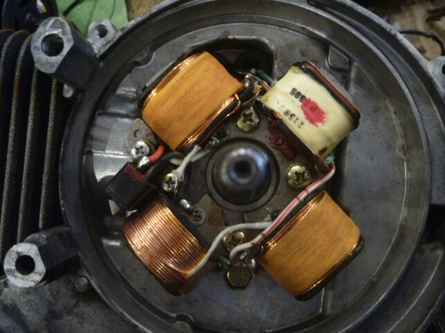 再度、バッテリーを付けて再測定・コイル・配線・各部点検・見直し・部品の組み替え等やってみる予定。それで好転する可能性もナキニシモアラズ。レギュレーターレクチファイアも中古部品を使用して組んでますので。