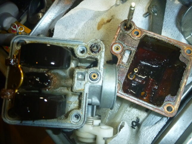 内部は~まあまあな状況。ニオイはそうでもない。加速ポンプの棒はガッチリ固着。
